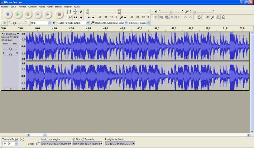 A imagem abaixo corresponde a onda sonora da voz de um dos alunos no Audacity gravando o programa da RP para o dia do folclore.
